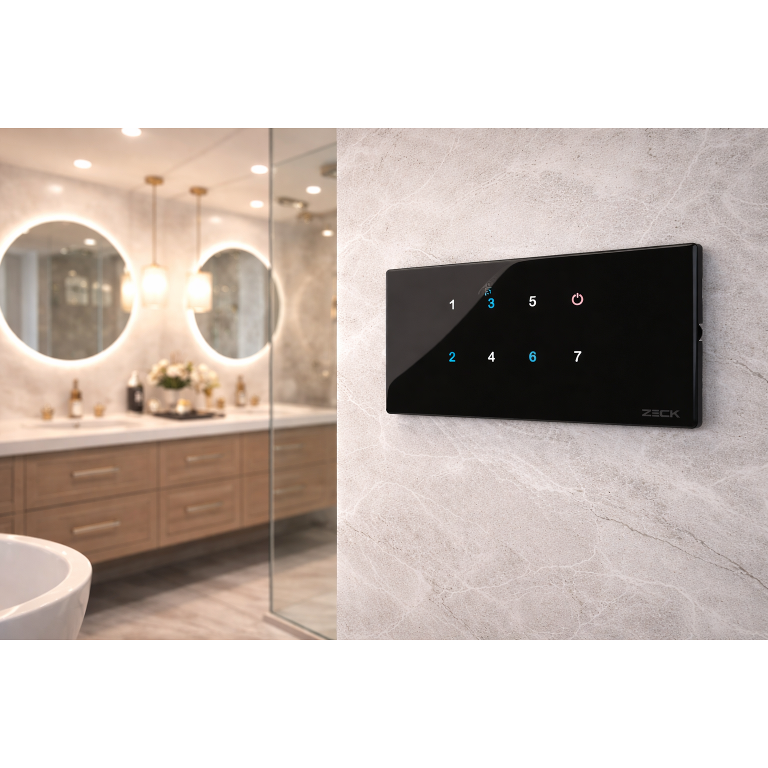 Elevate your bathroom aesthetics with this sleek glass smart touch panel, designed to blend seamlessly with modern premium interiors. Its glossy black finish, soft illuminated touch controls, and minimalist design create a sophisticated and high-end look. Perfect for controlling lights, fans and smart functions, this panel adds both style and intelligent convenience to contemporary bathroom spaces.